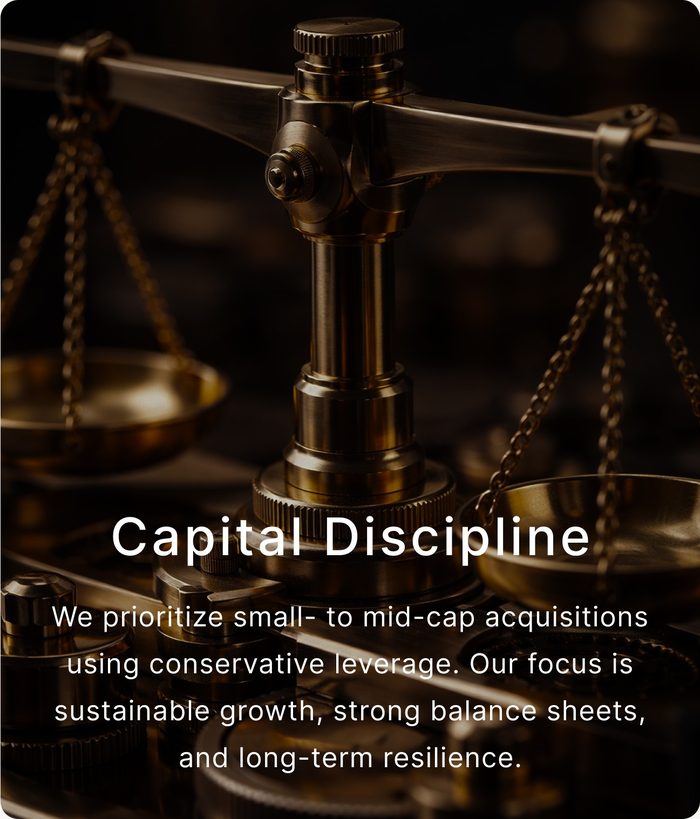 Our strategy focuses on acquiring established businesses and transforming them into scalable, technology-enabled platforms. We prioritize durable cash flows, structural defensibility, and long-term value creation through disciplined execution.